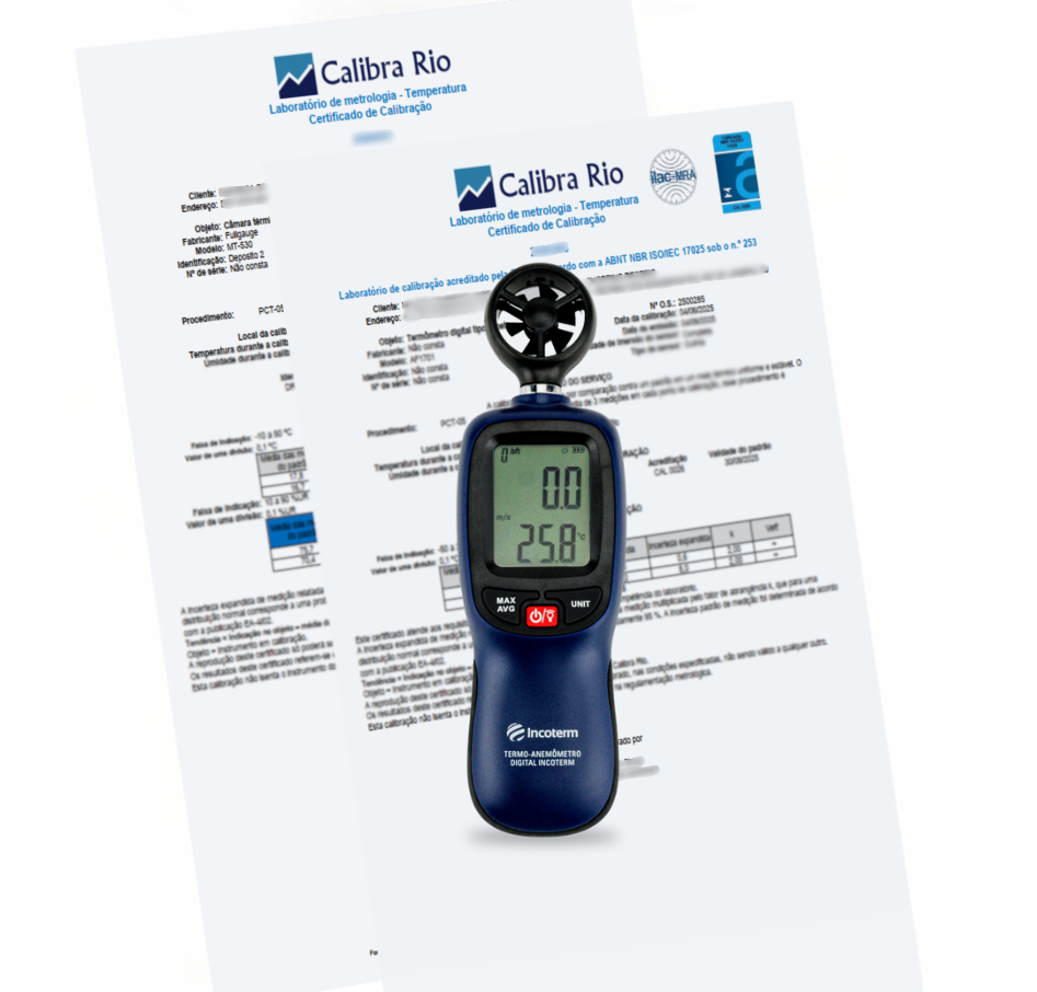 • O certificado de calibração com selo de acreditação (RBC) se refere exclusivamente à função de medição de temperatura. O certificado de calibração rastreável se refere à função de medição de velocidade do vento. Os certificados de calibração são disponibilizados apenas de modo eletrônico em formato PDF, numa pasta online (nuvem) de acesso exclusivo via smartphone, tablet e computador, podendo ser impressos, salvos ou simplesmente acessados a qualquer momento pelo comprador.